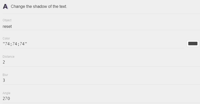 - You can set a Shadow using the action "text shadow/show shadow". When changing the shadow, you can choose the color, distance, blur, and angle. This can also be used to create a glow effect with bright colors.