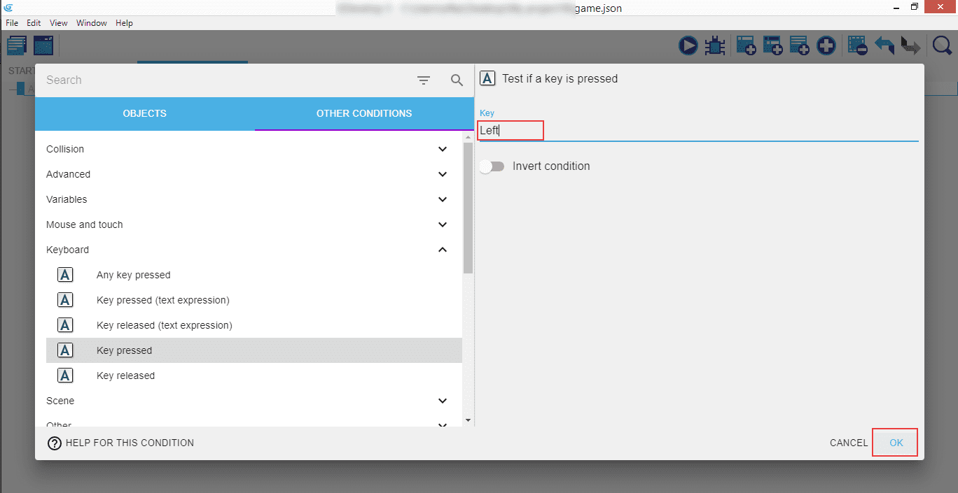This tests if a specific key has been pressed - enter "Left" into the "Key" field, then click "Ok".