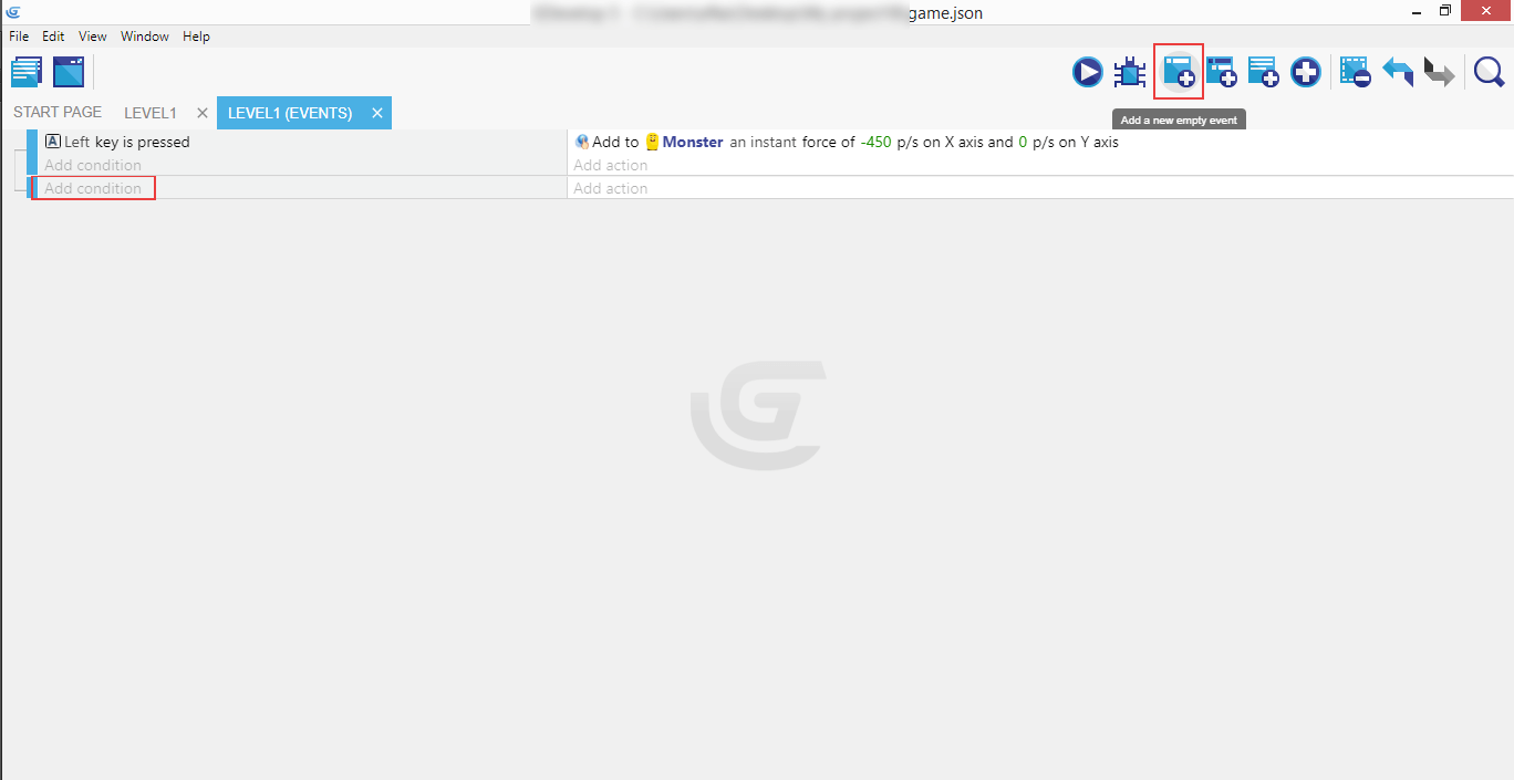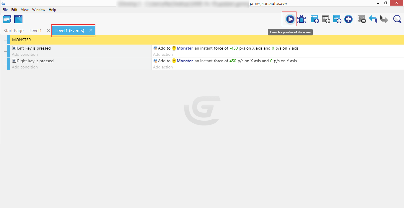 Drag the Monster from the right panel containing the objects onto the scene and click on the "Level1 (Events)" tab.