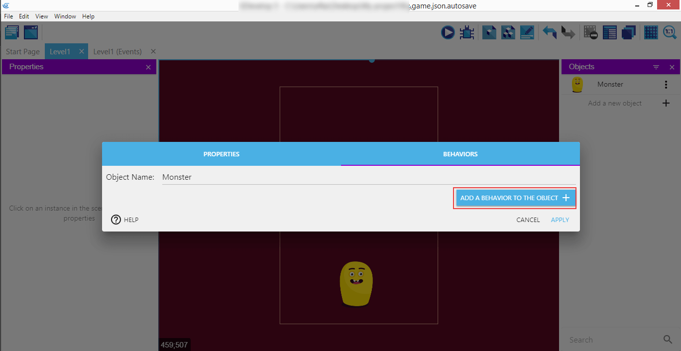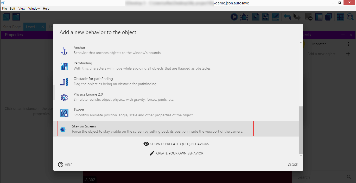 It's the "Stay On Screen" custom behaviors that we're going to use for the Monster.