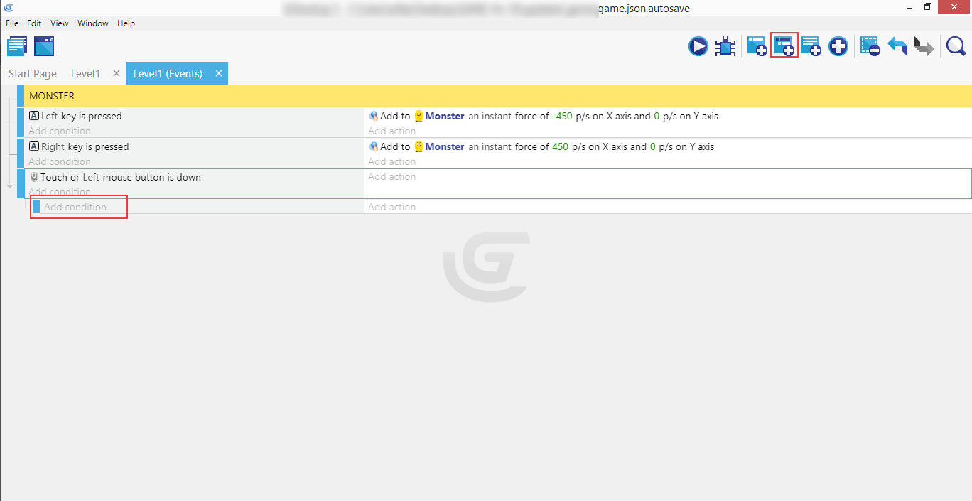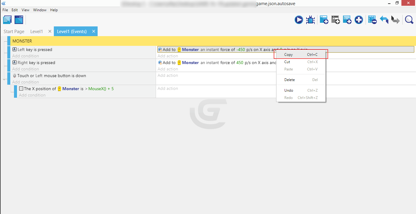 If you completed the right movement, both events with their conditions and actions should now be in place, so the Monster can move in either direction - left or right.