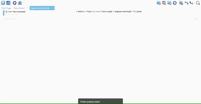 Click on the "Base Scene (Events)" tab to open the events editor, where we define the rules of the game using conditions and actions. Click on the event icon to add an empty event.