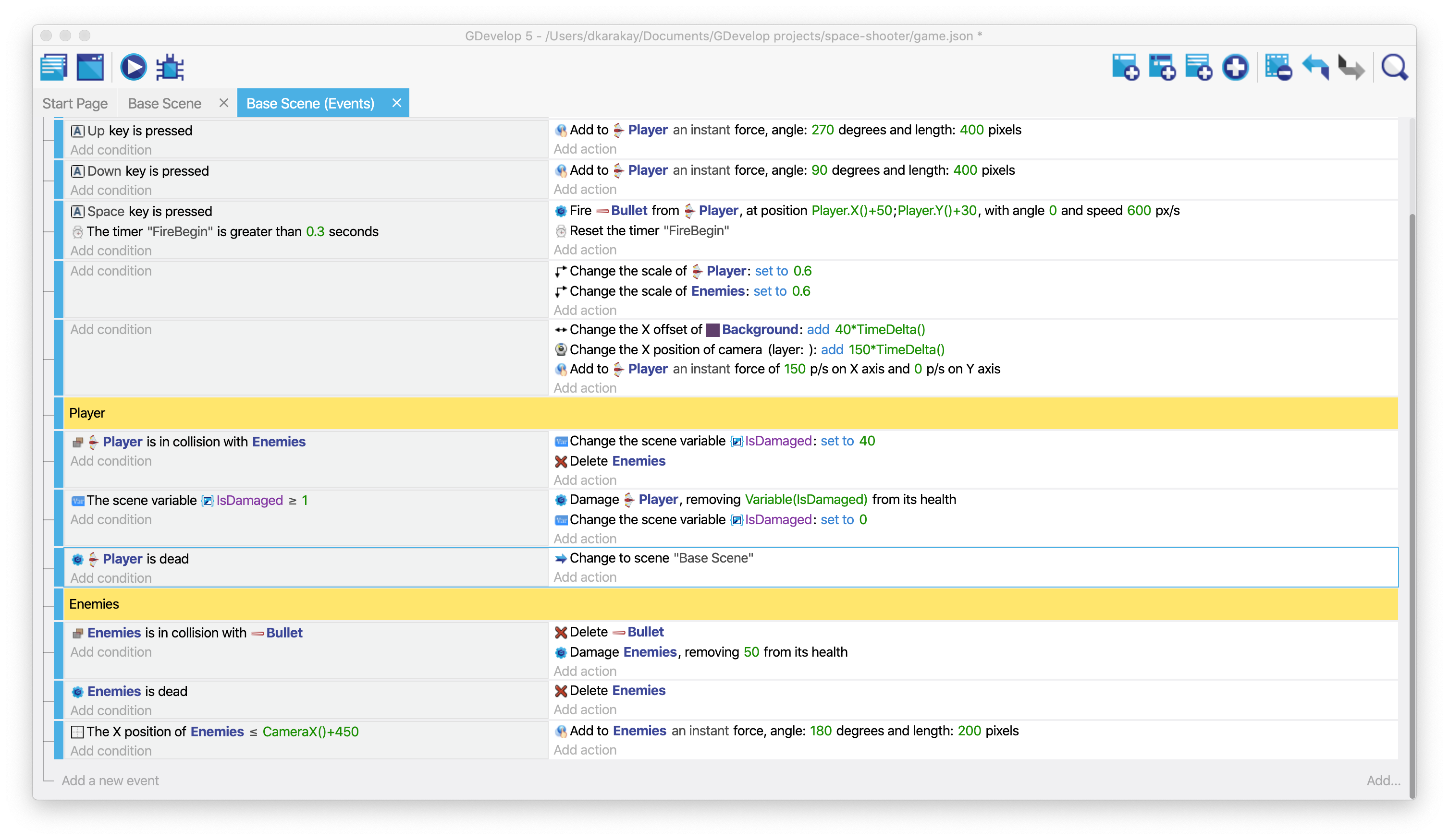 Our game is over when the player is dead. Add a new condition to check the player is dead or not. Then, add an action to restart the game. Type "scene" on the search bar and select Change the scene. Just select the "Base Scene" or your scene's name.