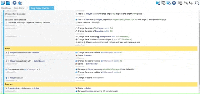 Open the Events tab and copy the condition and the action (Player collision with BulletEnemy), then paste it. Replace BulletEnemy in the condition and the Delete action with Meteors and ensure that IsDamaged is equal to 30.