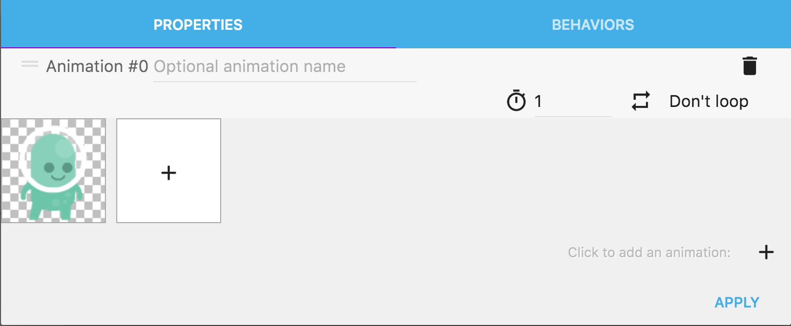 对象暂时为空。精灵对象由动画组成,每个动画可以包含一个或多个图像。让我们添加一个动画!单击“+”按钮。