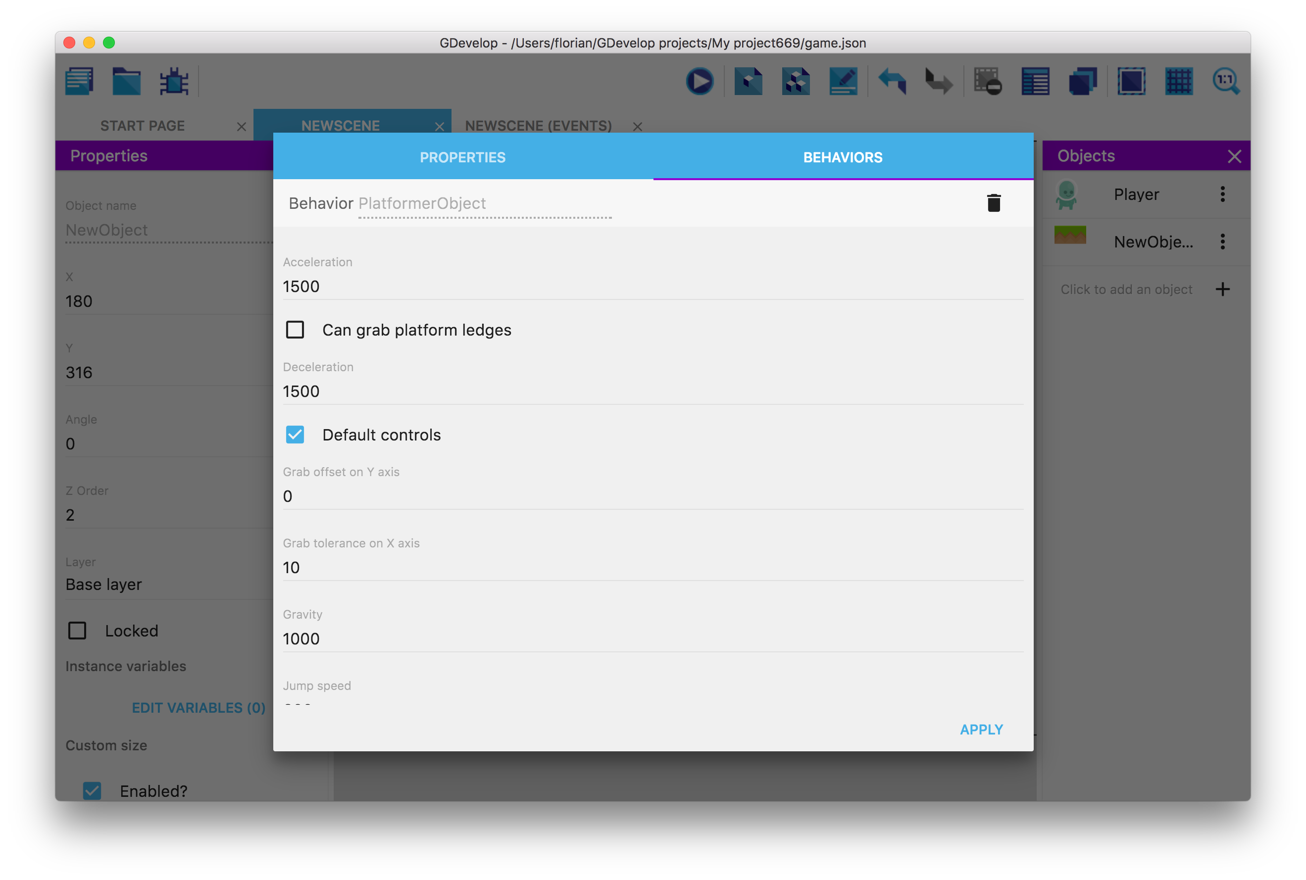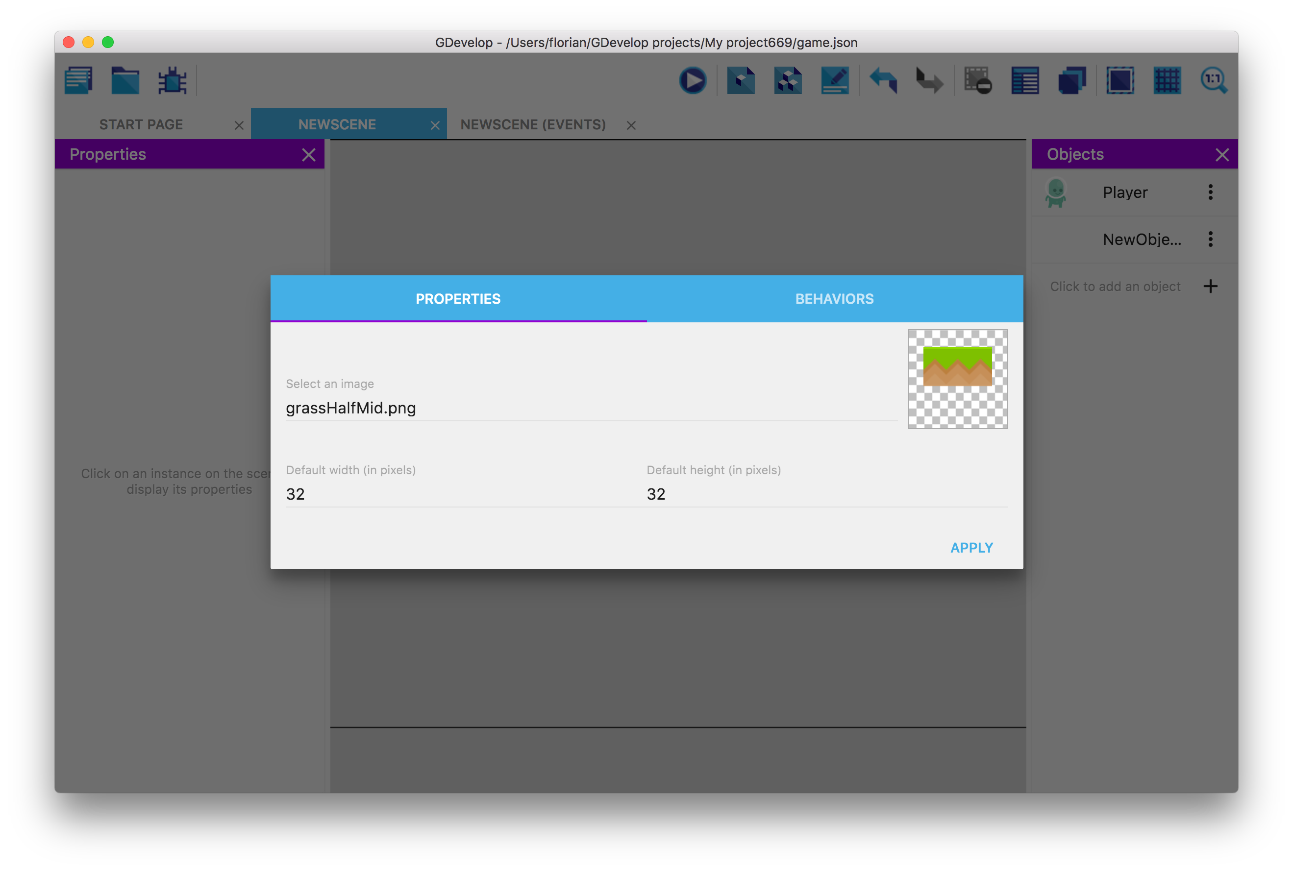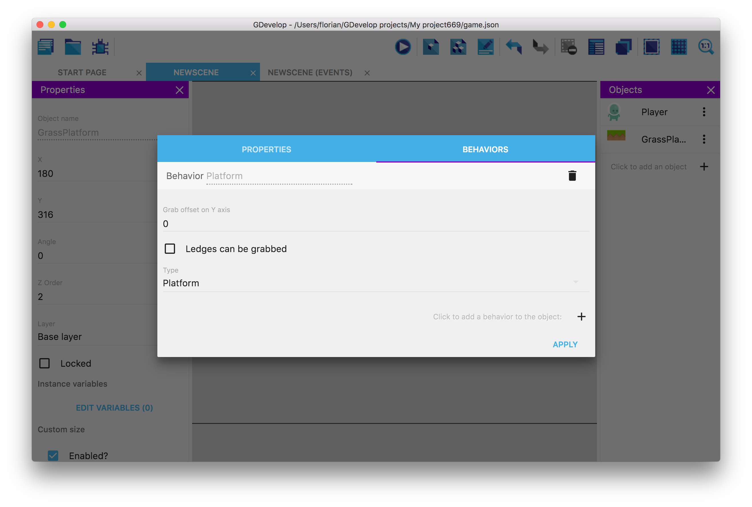 要将GrassPlatform对象设置为平台,请打开GrassPlatform对象编辑器。切换到“行为”选项卡,然后添加行为:这次,选择“平台”行为。