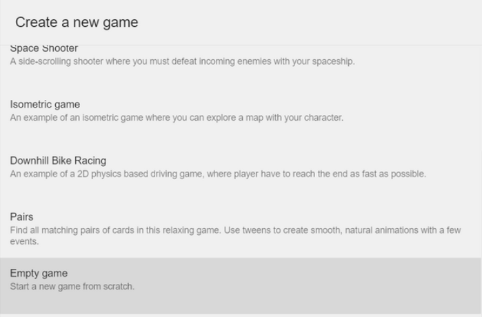 在开始页面点击 Create a new project. 在窗口中, 为你的项目选择一个文件夹并且选择Empty project 开始一个新的游戏。